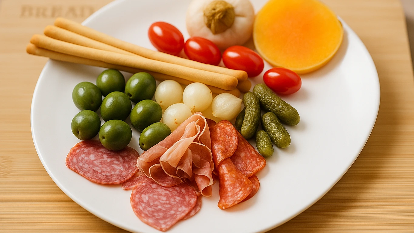 Three slices each of cacciatora salami, aged Parma ham, and spicy pepperoni, served with five buttery Sicilian Nocellara olives, five tangy pickled silverskin onions, and crunchy pickled cucumbers. Served with breadsticks.Three slices each of cacciatora salami, aged Parma ham, and spicy pepperoni, served with five buttery Sicilian Nocellara olives, five tangy pickled silverskin onions, and crunchy pickled cucumbers. Served with breadsticks.